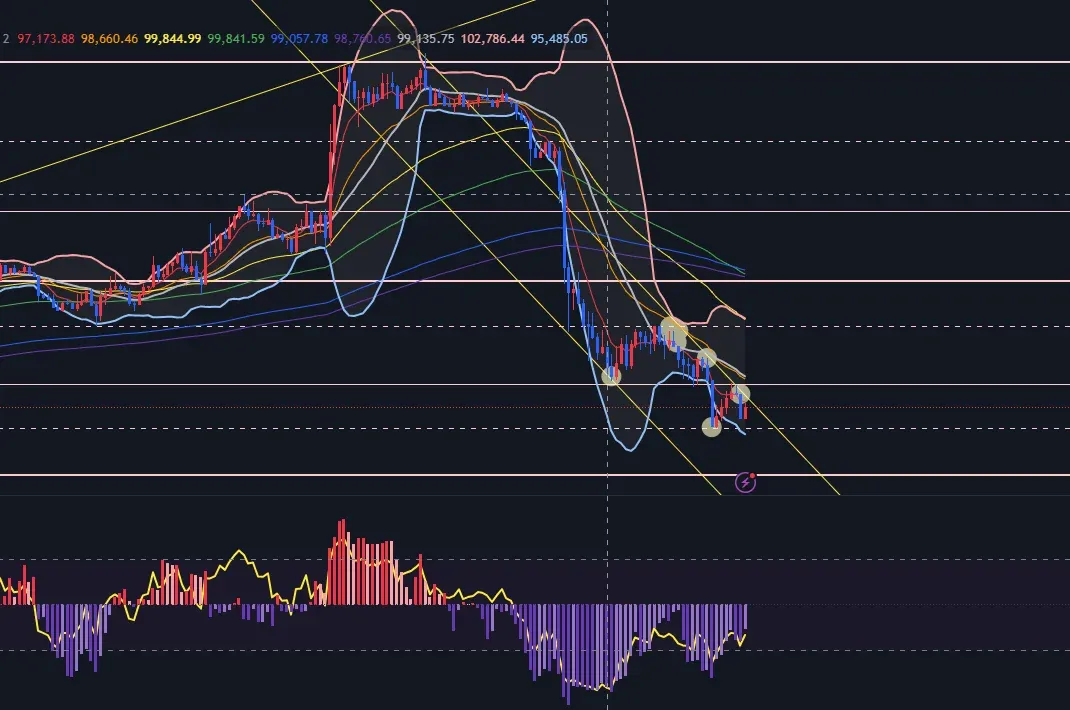하락추세와 과매도 상태, 볼린저밴드 가운데를 뚫지 못하고 떨어지는 형태여서 바로 위 지지저항선 96200을 손절가로 진입하였습니다.