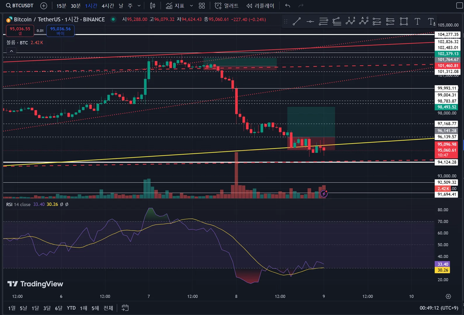 거래량 감소, rsl 과매도 구간, 2-3달 동안 이어져오던 상승 추세선에서의 반등을 보고 손익비 측면에서 좋아보여 들어갔지만