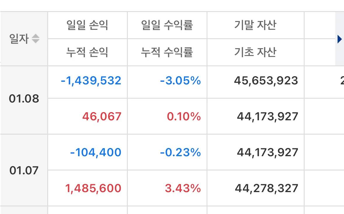 1/7에 수익을 보면서 이제서야 상승인가 싶었지만 1/8일에 수익을 모두 되물림했습니다 차트에 대한 이해도 현재 분석도 제대로 하지 못하고 있음을 느꼈고 어느 정도까지 하락할지에 대한 기준도 못 잡겠다 싶어서 일단 0.3BTC 전액 손절을 진행했습니다 다시 분석한 후에 재진입 해보겠습니다