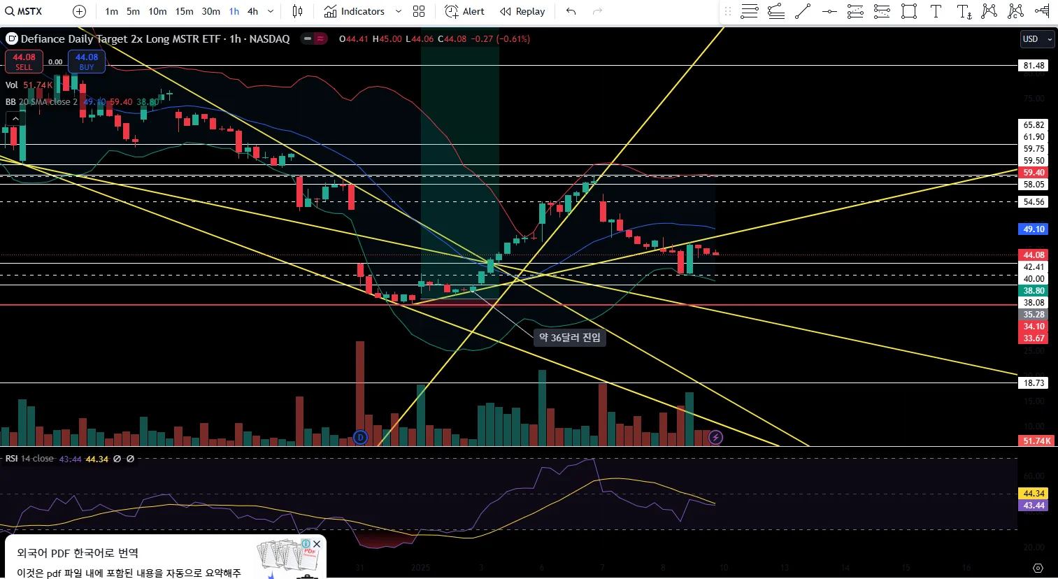 현재 MSTX라는 주식을 매입했고, 기존 하락 파동에서 상승으로 추세가 전환되었다 생각되어, 진입하게 되었습니다. 현재 진입 부분에서부터 상승하였다가, 59달러 쯤에 저항선을 맞고 점차 주가가 내려오고 있는 하락하고 있습니다. 현재 40달러 부근에 지지선을 받고 추세선에 다시 상승하다 주가가 내려가고 있으며, 기존 상승할때 보고 있던 노란색 추세선이 이제는 차트가 저항을 받아 하락하는 저항선이 되었습니다. 현재 40달러 부근에서 반등을 해주었고, 다시 주가가 내려갔지만 추후에 차트가 어떻게 되는 지 확인 후 손절 및 익절을 하려고 합니다. 비트코인 및 나스닥이라는 시장이 수요일 대폭 하락하였고, 그런 관점에서 아직 반등을 할 수 있는 여지는 있다고 보여지기에 아직은 수익구간이니... 제가 설정한 목표 주가에 맞춰 분할 매도 및 익절을 할 수 있었으면 좋겠습니다. 감사합니다.