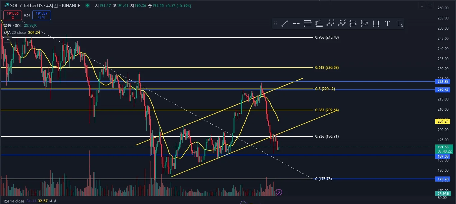 솔라나 추세선을 위와 같이 그려 196달러에서 x10 롱포지션에 진입했으나 추세가 깨지면서 손실중에 있습니다.