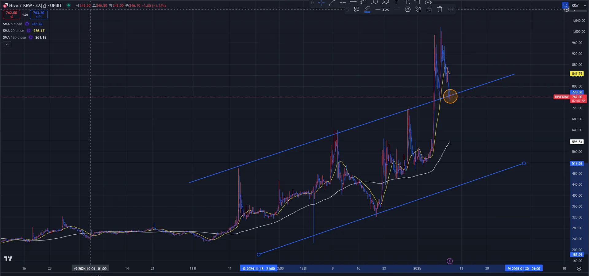 이건 같은 종목의 4시간봉 차트이고, 위와 같이 추세선을 그려보았습니다. 채널 상방을 강하게 돌파 후 상단 추세선에 지지받는 자리가 주황색, 즉 위에서 봤던 수평 지지/저항과 겹치는 부분으로 생각됩니다.