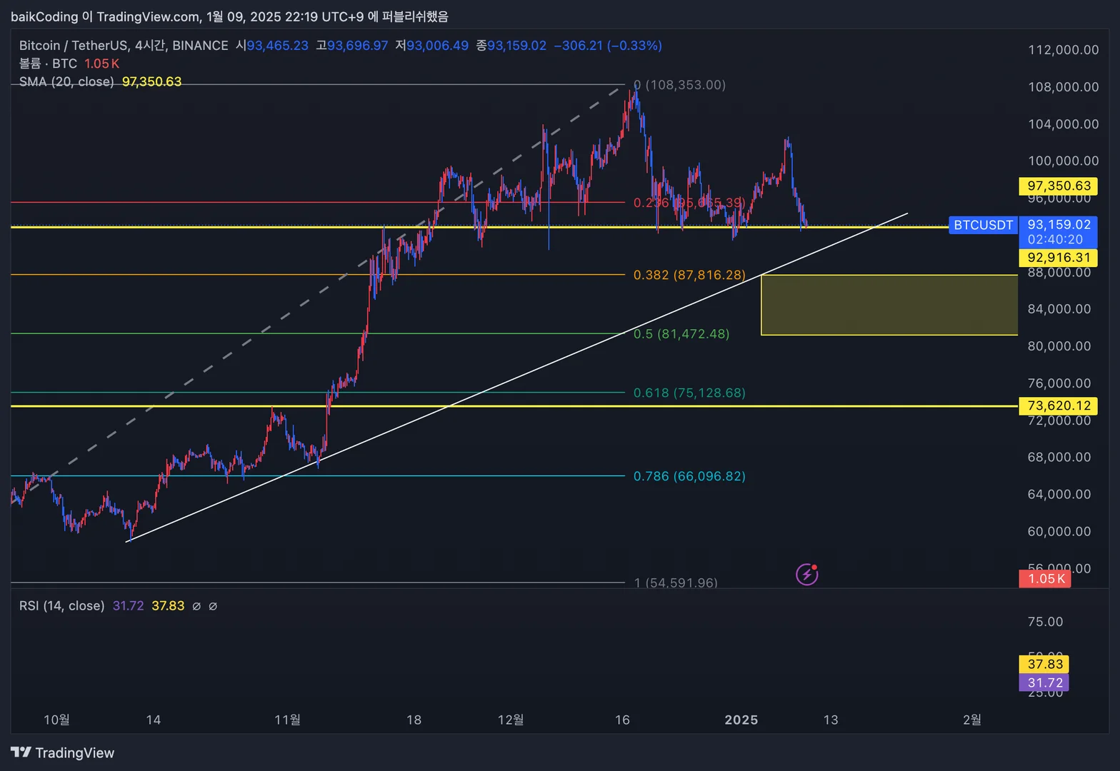 해당 구간 뚫릴 시에는 하락 추세가 진행되어 81,500 ~ 87800 구간은 최소한 한번은 내려올것으로 판단합니다.