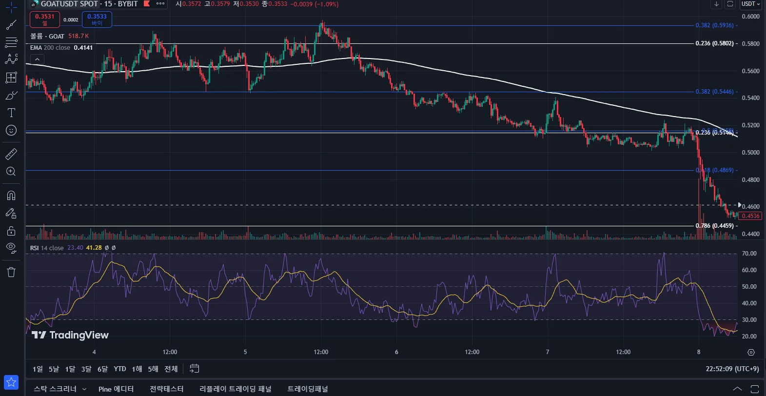 피보나치 되돌림 0.5에 도달하여 약간의 반등이 나올 것으로 예상했습니다. 실제로 반등이 나와서 수익을 보고 있었습니다.
