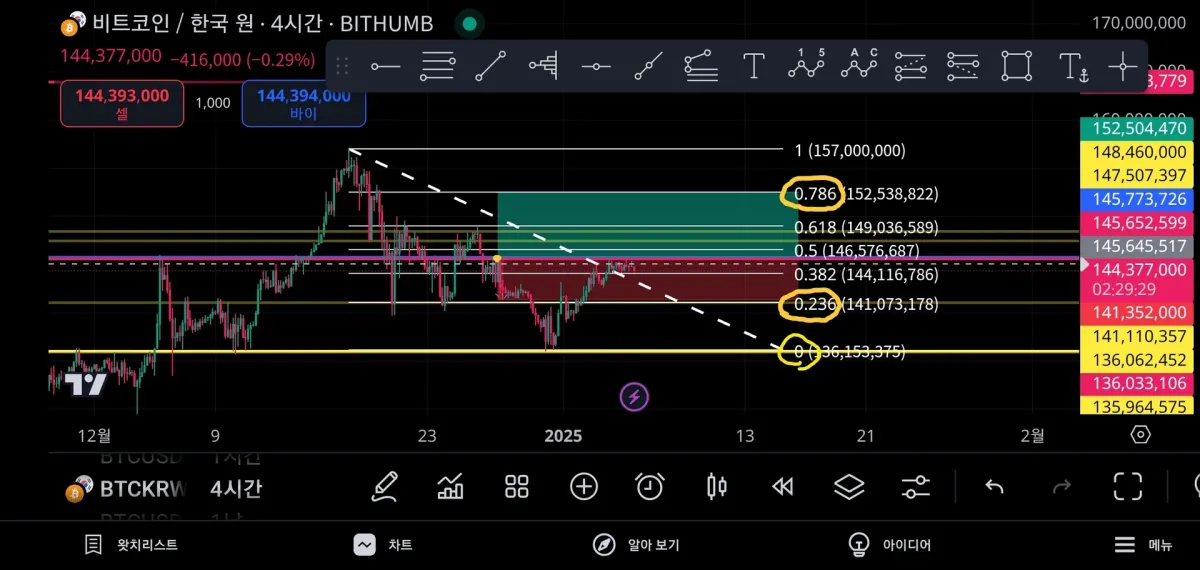 매수 연습으로 145,629.000에서 매수하고 피보나치 0.786에서 익절 계획했으나 143,136,000 과 143,218,000에서 손절했습니다
