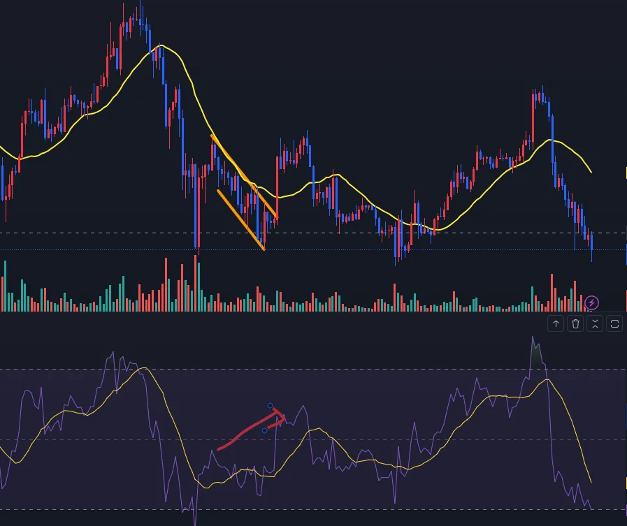 질문3. 가격도 낮아지고 RSI 낮아지는 상황은 어떻게 해석해야 할까요? 투자자들이 매도를 하고 있다고 생각하면 될까요?