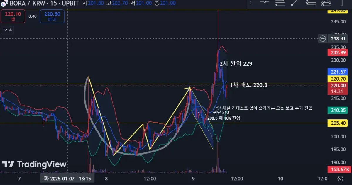 채널 리테스트 없이 올라가자 추가 매수 평단 210