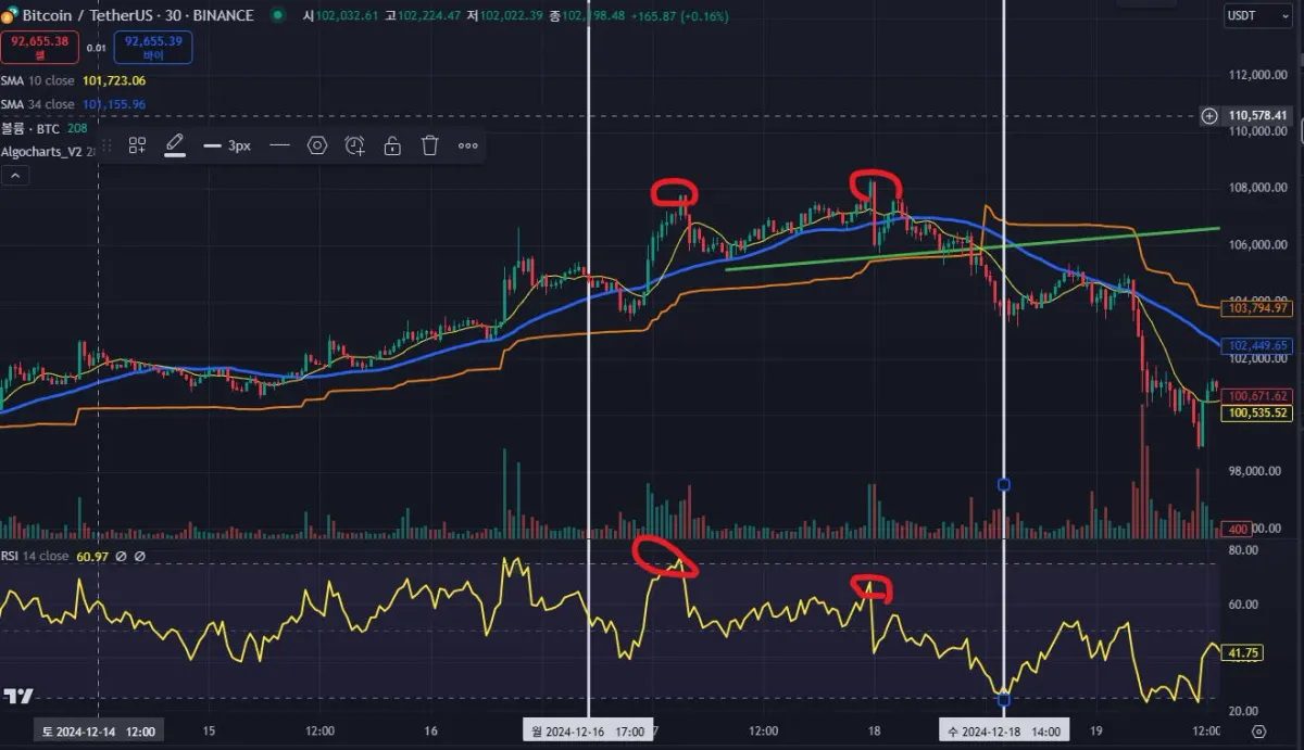 하락 다이버전스의 모양은 아니지만 새롭게 발견한 것은 RSI와 차트가 동일하게 올라가서 하락 추세선을 돌파하면 강한 매도의 추세가 이어진다는 것을 알게 되었습니다.