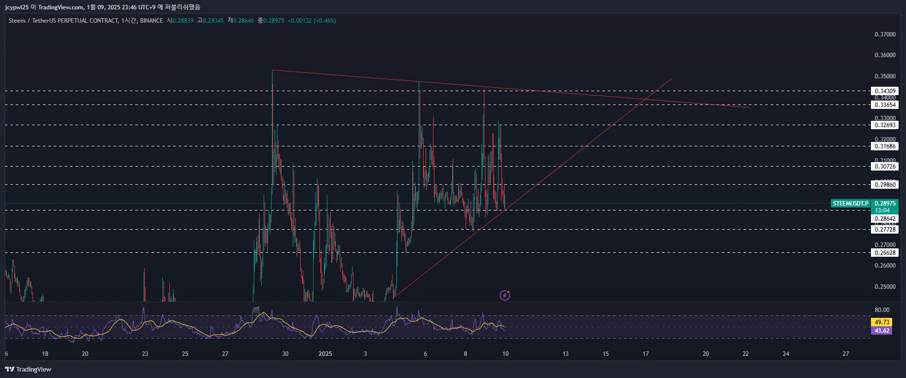 1시간봉상 전고점을 뚫지못하고 선을 하나씩 내려오는것을 보고 0.325776에 숏 포지션 진입후 작도한 지지선을 하나씩 내려가는것을 보다가 매도세가 약해지는것을 보고 최종적으로0.296포지션 종료하였습니다.
