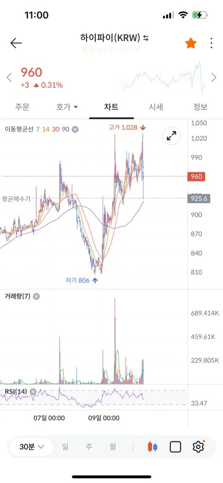 상승세에 현물이기때문에 손절은 안했습니다. 다만 시장에 변동성이 심한상태이고 보라색친곳은 매물대라고 생각하기에 내려오면 다시 매집을 해볼 생각입니다.