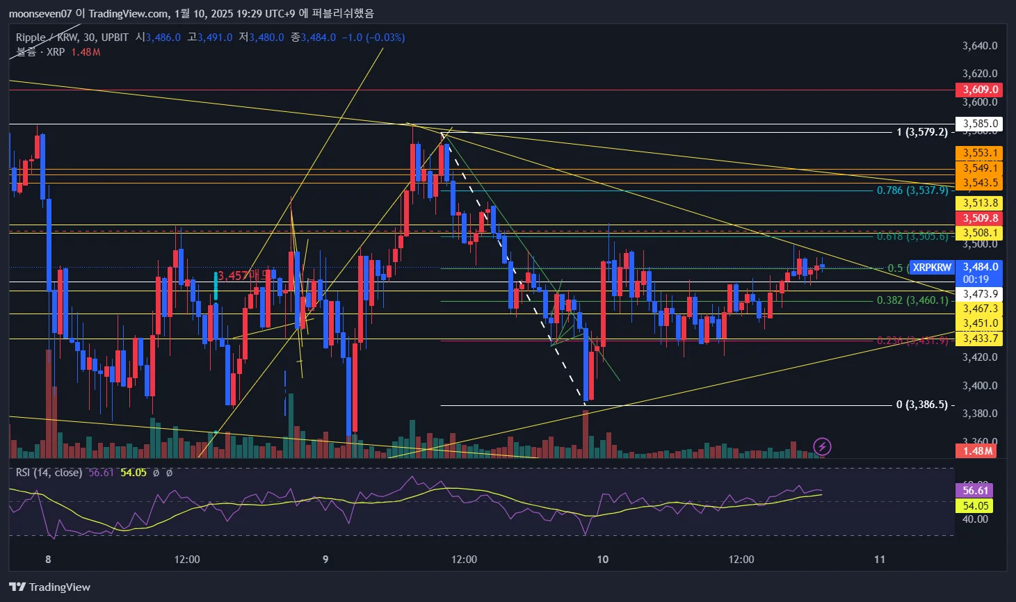 상승하여 피보나치 되돌림 0.618구간 3,494원에 익절하였습니다.