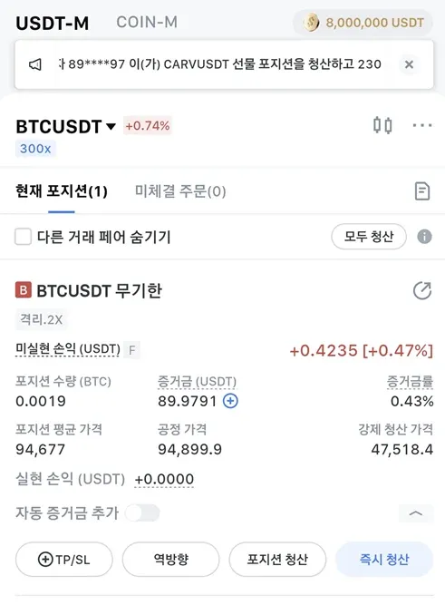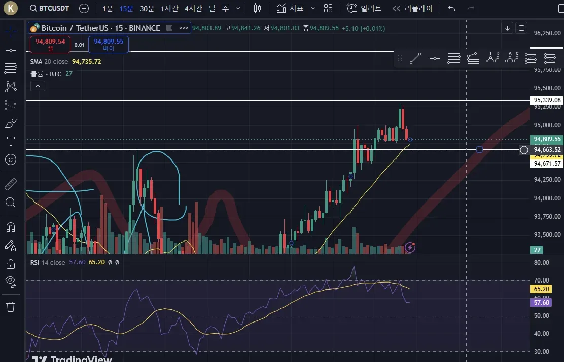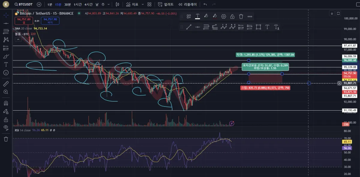 95339 저항 이후 다음 저항선인 94677 무렵에서 매수주문 넣었고 현재 체결된 상태로 대기중 입니다.