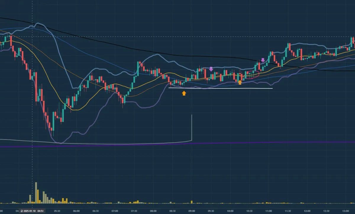 흰선손절잡고 진입후 볼벤상단저항맞고 올라오길래 포지션 종료햇습니다