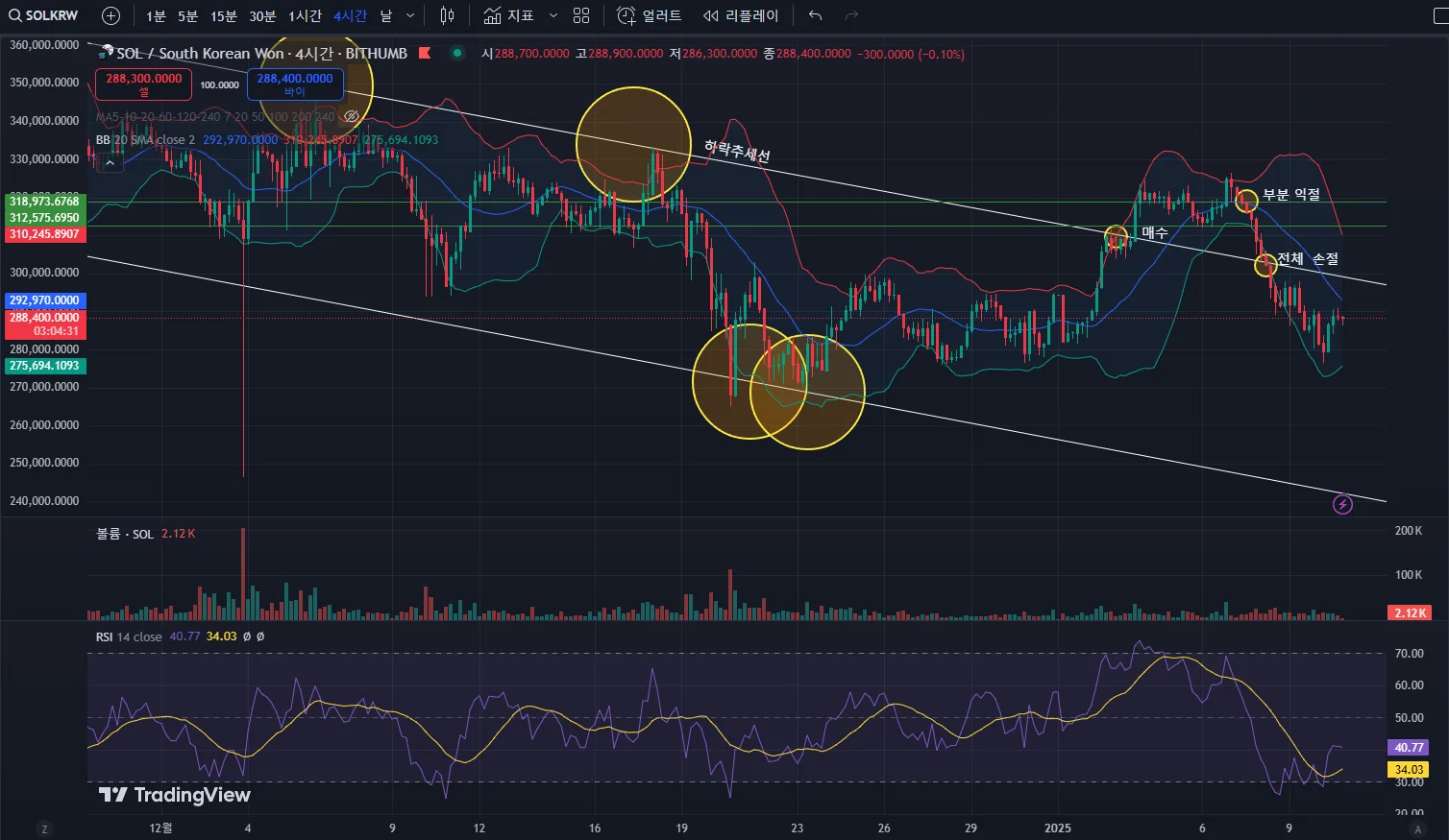 지난번 과제때 매수하였던 솔라나 4시간봉 차트입니다. 중간에 더 큰 수익구간도 있었으나 제가 생각한 매도 자리가 아니라 지속적으로 홀딩중에 다시 가격 하락하면서 제가 설정한 익절라인데 닿으면서 75%물량을 매도 익절하였습니다. 그 이후 나머지 물량은 계속 갖고 있었으나, 지속적으로 하락하여 설정했던 하락추세선까지 닿으면서 나머지 물량 전체 손절하고 나왔습니다.