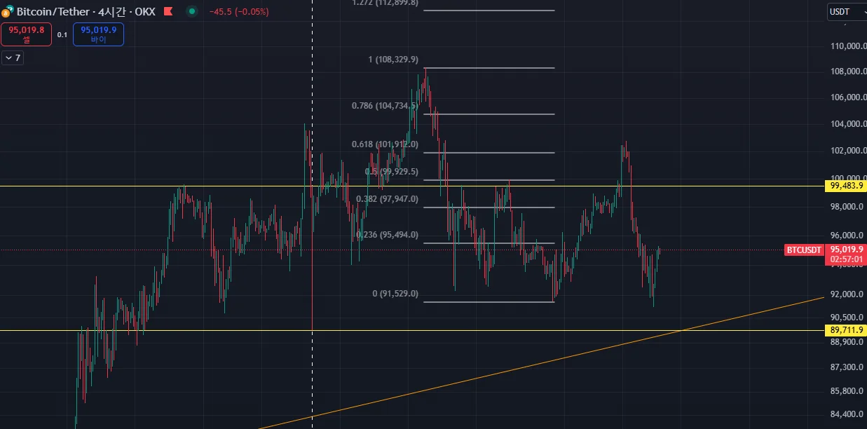 이에 타점을 잡아본다면 91.5K 부터 89.7K까지 분할 진입을 하면 손익비가 괜찮아 보인다.