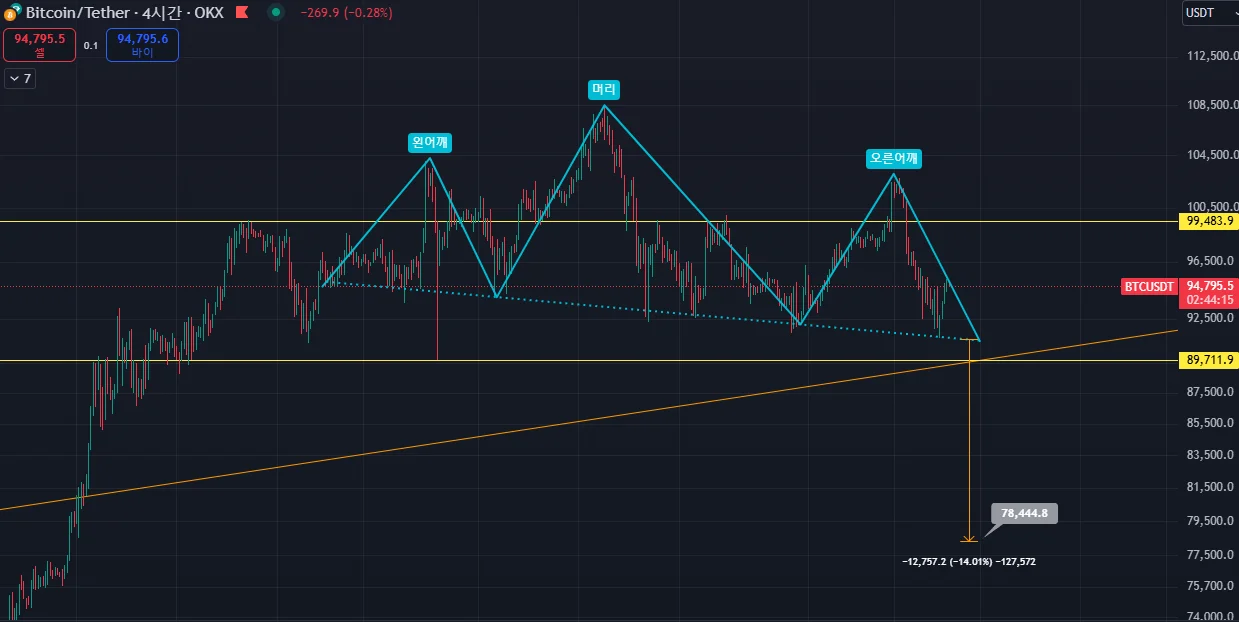 만약 91.5K 정도의 라인이 뚫리게 된다면 넥라인이탈이 되므로 강한 하락이 예상이 되는데