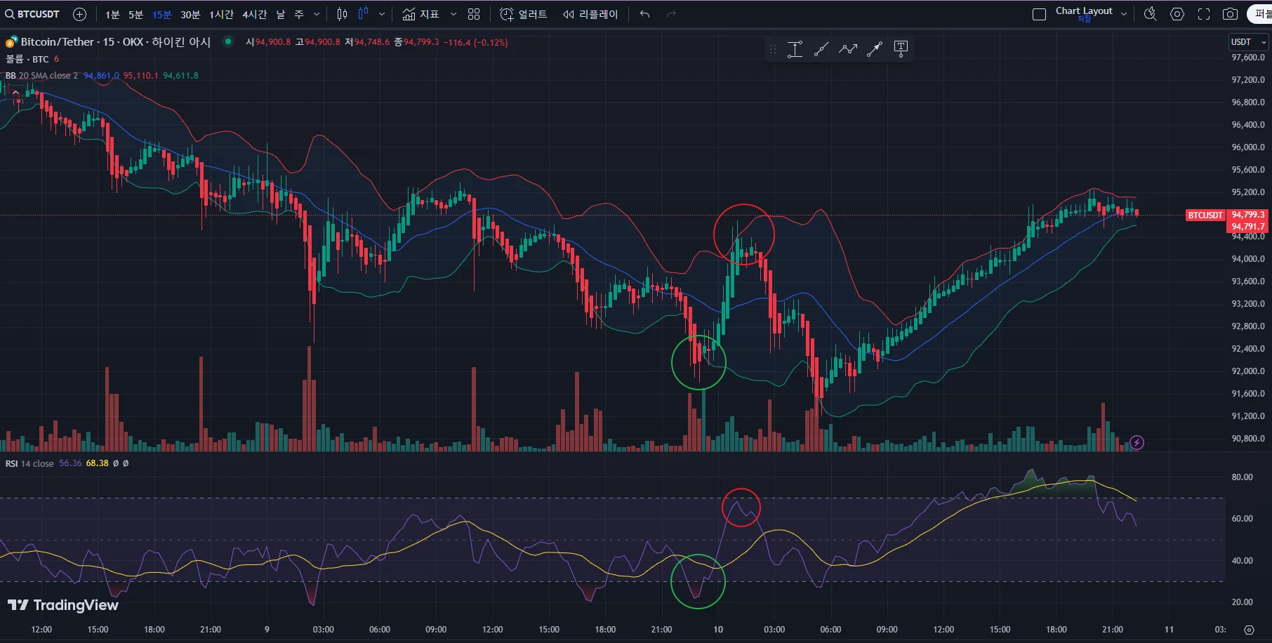 볼린저 밴드 하단에서 RSI과매도 일때 매수시점으로 하였고,