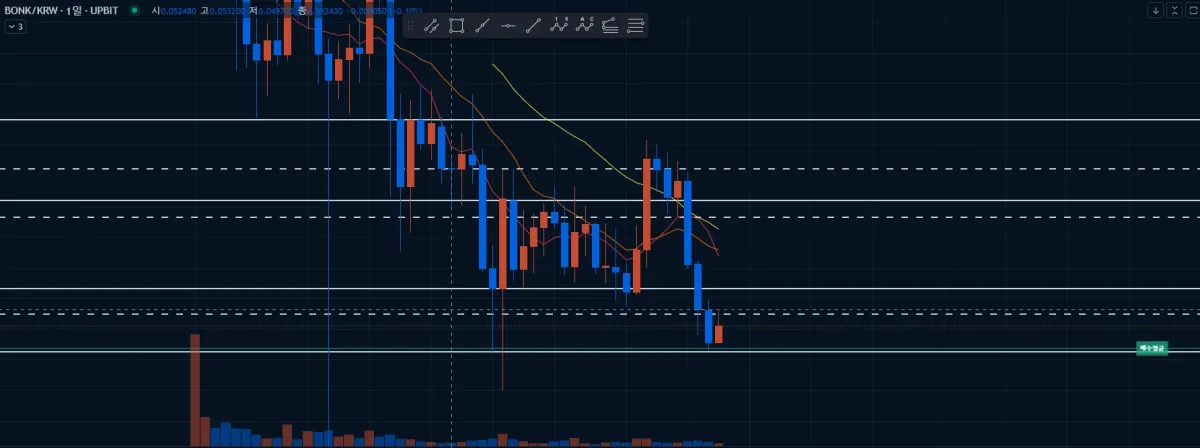 봉크 진입해 봤습니다. 점선이 있는 곳에서 반익 했고요, 지금은 관망중이네요. 5~6퍼 이익이지만 그래도 수익이라 게시해 봅니다.