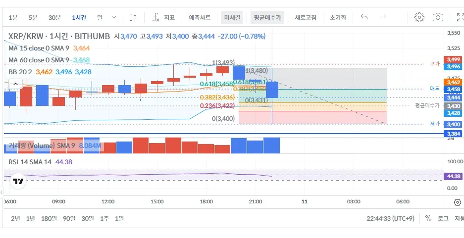 목표가: 피보나치 0.618라인으로 라인에 살짝 아래인 3,458원을 매도목표가로 잡았습니다.