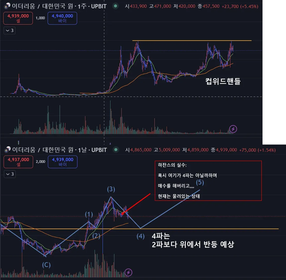 업비트 거래소에서 이더리움 주봉으로 컵위드핸들을 보았고, --> 1번째 사진