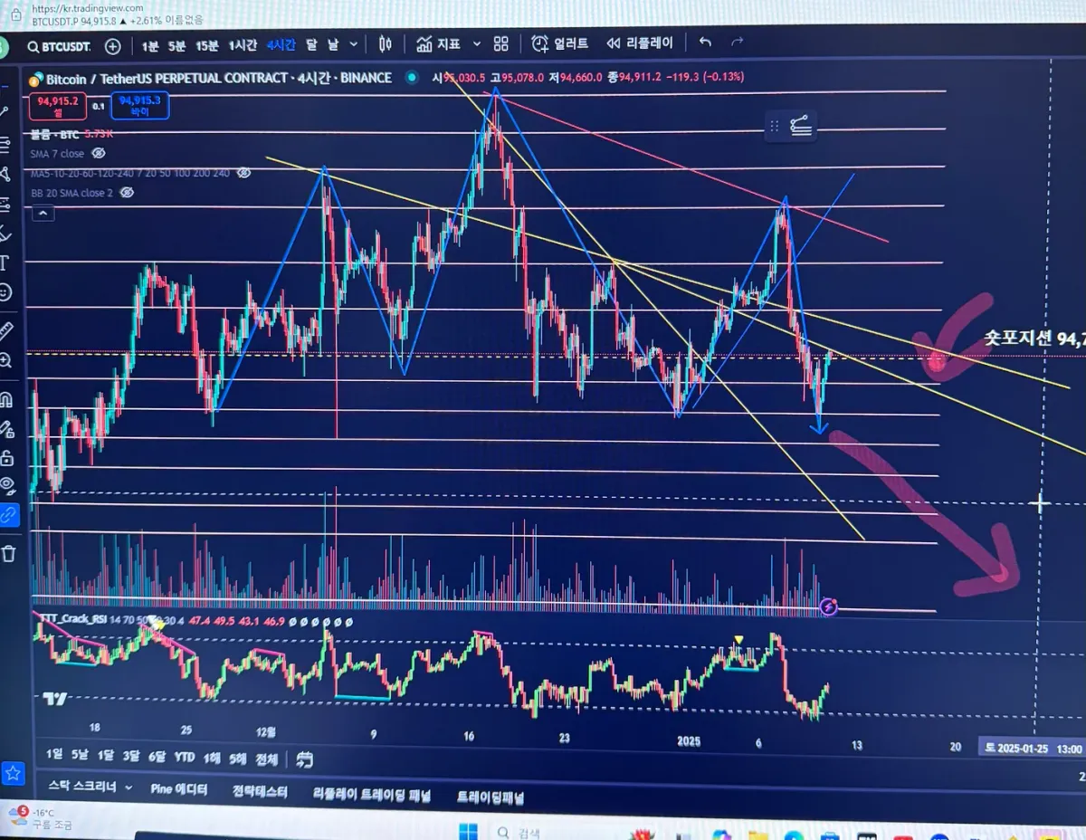 헤드엔숄더 패턴의 4시간 봉에서 하락장이 예상되어 94,7에서 숏포지션을 잡았습니다 다행이 미국 고용지표 발표와 맞물려 익절에서 마무리가 되었습니다.