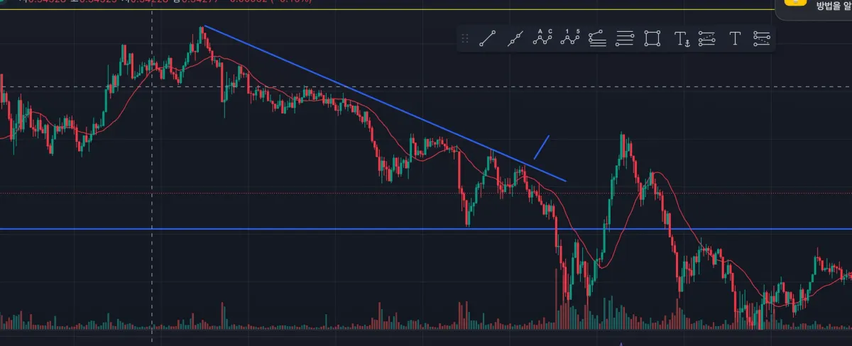 근거 2 : 추세선을 맞을 때 거래량 증가한 윗꼬리 등장 -> 하락매도가 들어온다고 판단.