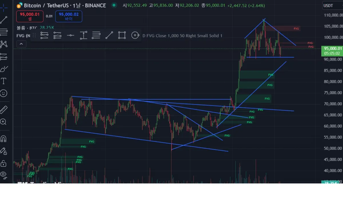 비트코인 일봉을 보이는대로 작도했는데 현재는 삼각수렴이 아닌가 생각이 듭니다~ 고견 부탁드립니다.!