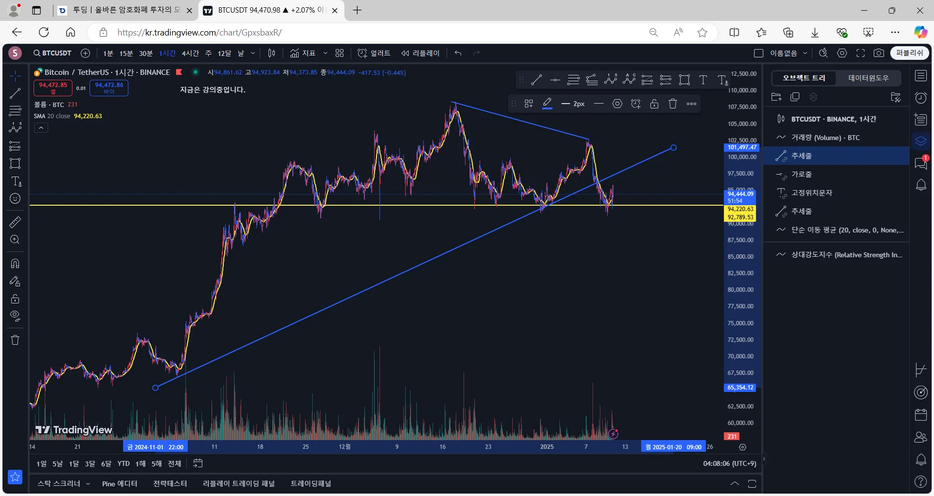 1시간봉, 일봉별로 지지선과 추세선의 각이 조금 다른 것 같기는 하나 일단해보면서 익히겠습니다.