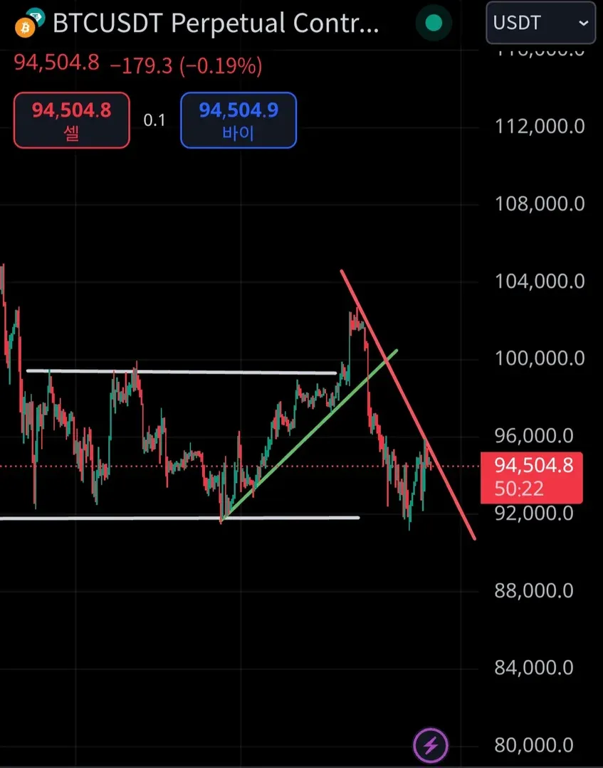 흰색 92k 선을 지지, 99k 선을 저항이라 생각해 작도 하였습니다.