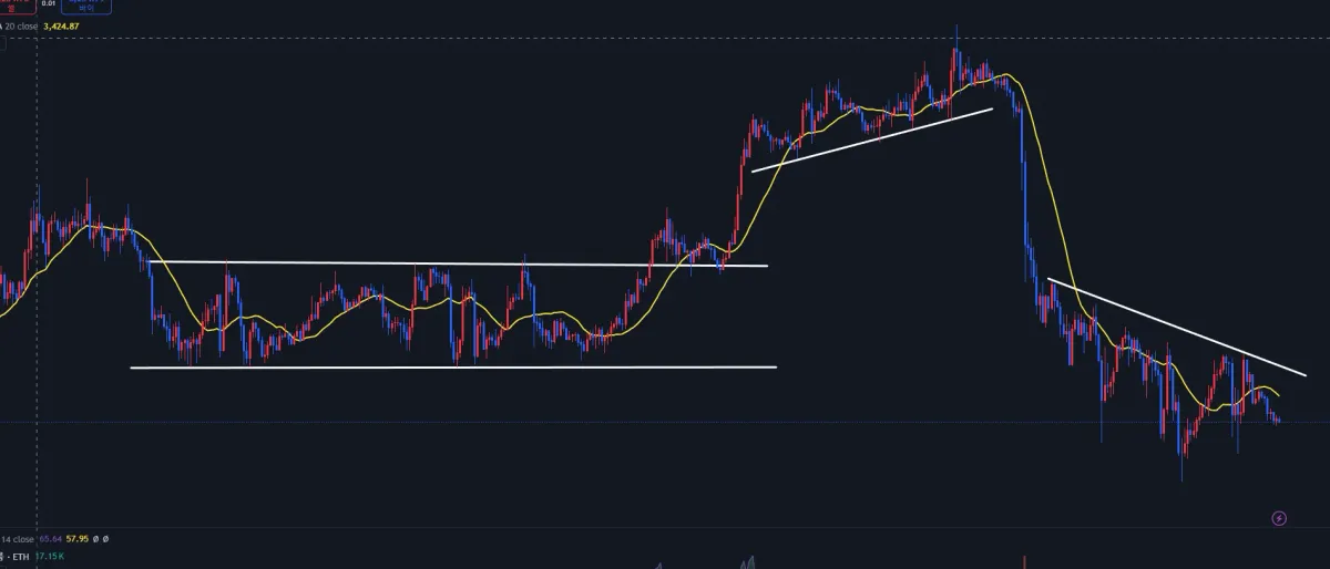 이더리움 1시간봉입니다. 박스권에서 저항선 깨진 후 리테스트 받아 상승하는 모습 보입니다. 상승 후 상승추세 지속의 추세선, 하락추세로 전환 후 하락 추세선 그려보았습니다.