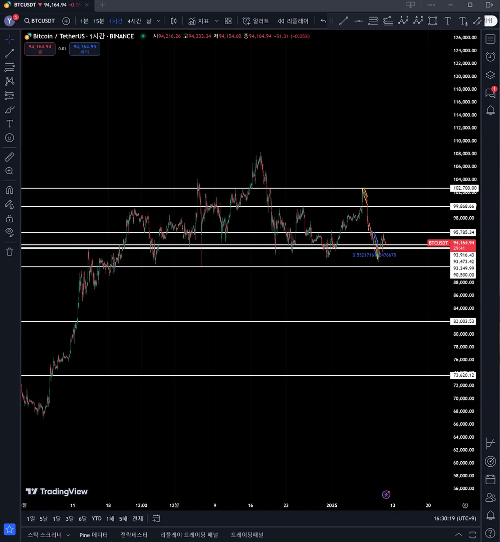 현재 지지저항 구간인 95k와 94k 구간을 넘어가면 크게는 88k까지도 급락할 가능성이 보여집니다