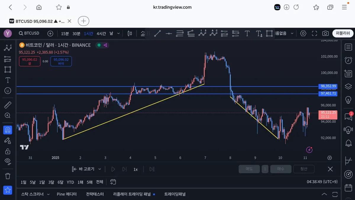 상승 추세선 후 중간에서 지지선 및 저항선 나오고, 이후 저항선 돌파 후 서서히 하락하여 지지선이 된 저항선 돌파후 하락 추세를 보여주고 있습니다.