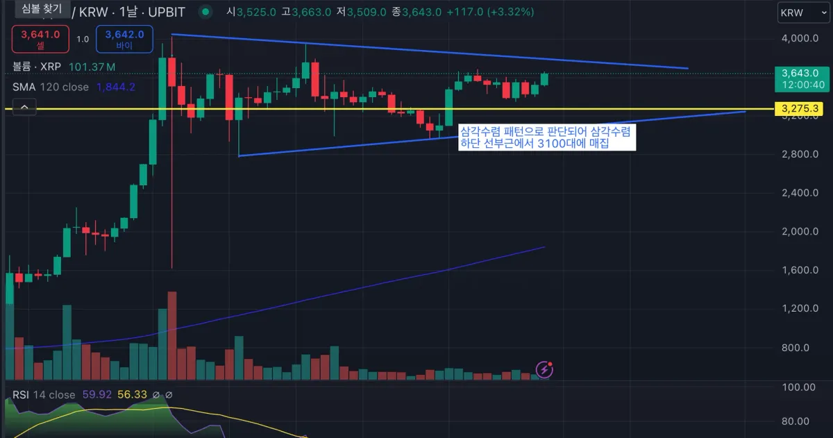 리플 삼각수련 패턴으로 판단하여 삼각수렴 하단선 매집 후 아직 홀딩 중입니다. 삼각수렴 패턴 후 보이는 양상에 따라 익절 혹은 손절 고려하려고 합니다.