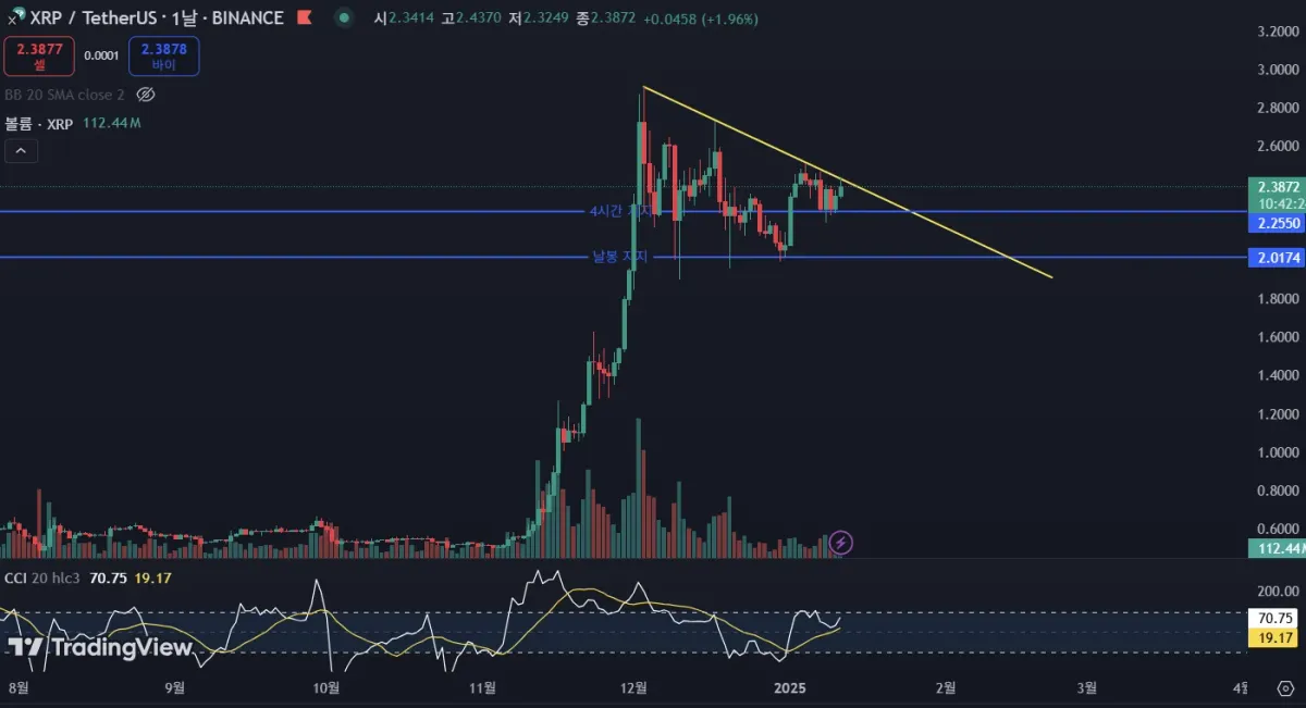 2가지 지지선 모두 신뢰성이 있어보입니다. 뚜렷한 거래량과 함께 삼각 수렴 패턴에서 벗어나는 움직임을 보이면 포지션을 진입해볼 생각입니다. 또한 RSI 지표와 비슷하게 신호를 주는 CCI 지표도 과매도 신호를 주지 않고 있어 포지션 진입 자리를 기다리고 있는 상황입니다.