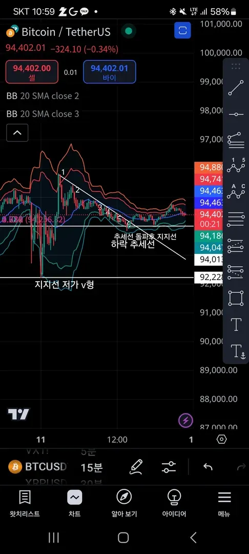 15분5분1분봉에는 비교적 긴 시간의 봉보다 추세선이나 지지저항이 잘 안그려지는거 같습니다