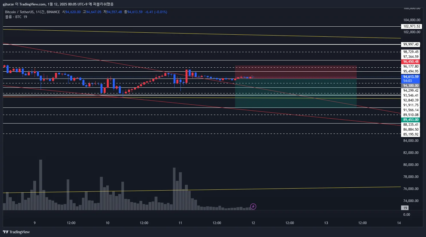 94300 일봉 저항선과 93546 1시간봉 지지선 사이에서 캔들이 횡보하고 있는거 확인