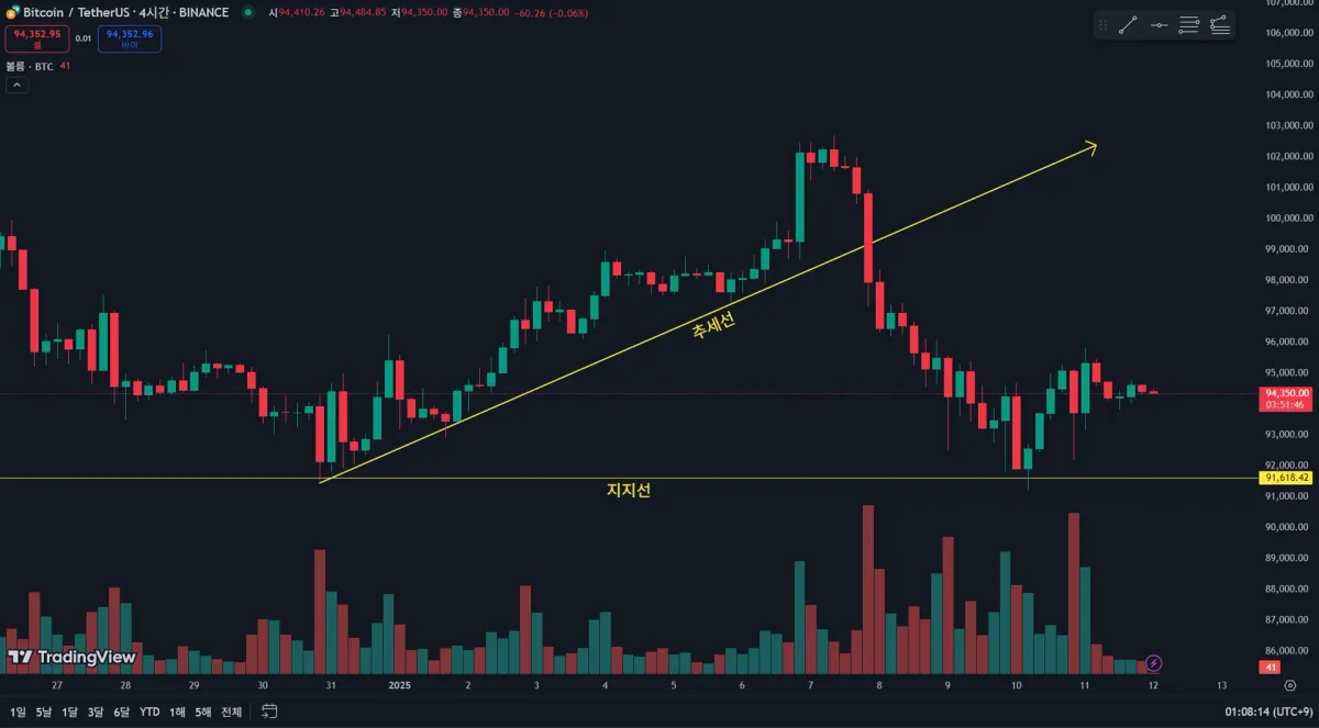 12월 말일부터 현재까지의 4시간봉 기준 추세선과 지지선입니다.