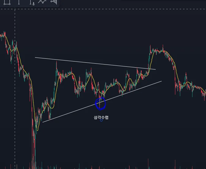 강사는 아니지만 삼각수렴 이라 볼수 있을것 같습니다. 그부분이 노이즈로 볼수도 있을것 같고 좌측에 라이징 웻지 부분부터 잡아보시면 조금 더 깔끔할것 같아요
