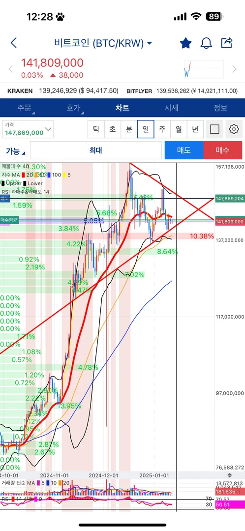 삼각수렴으로보고 상승추세선 아래로 하락시 손손절하락추세선및 매물대 부근 부분익절 예정