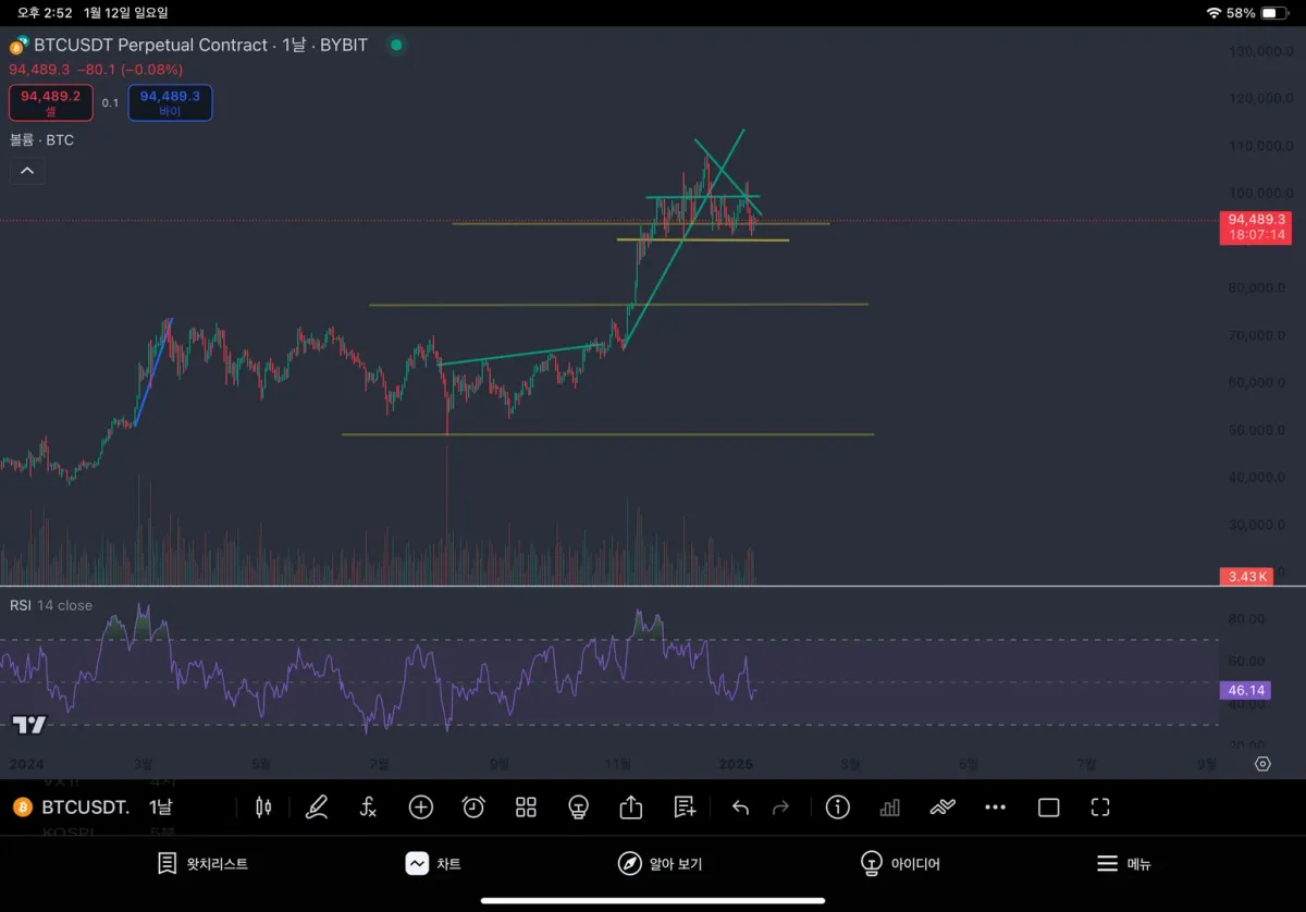 차트가 너무 지저분한점 죄송합니다 ㅠㅠ 일봉으로 보니 라이징 웻지에 거래량 감소, rsi감소도 같이 보이는 거 같은데 맞을까요,,?