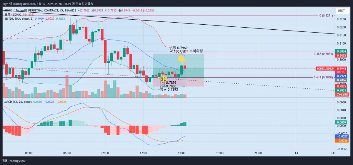 볼밴도 하단선이 먼저 위로 꺾인 모습을 확인하였고 피보나치에서 목표한 선에 도달하자 진입하였습니다.