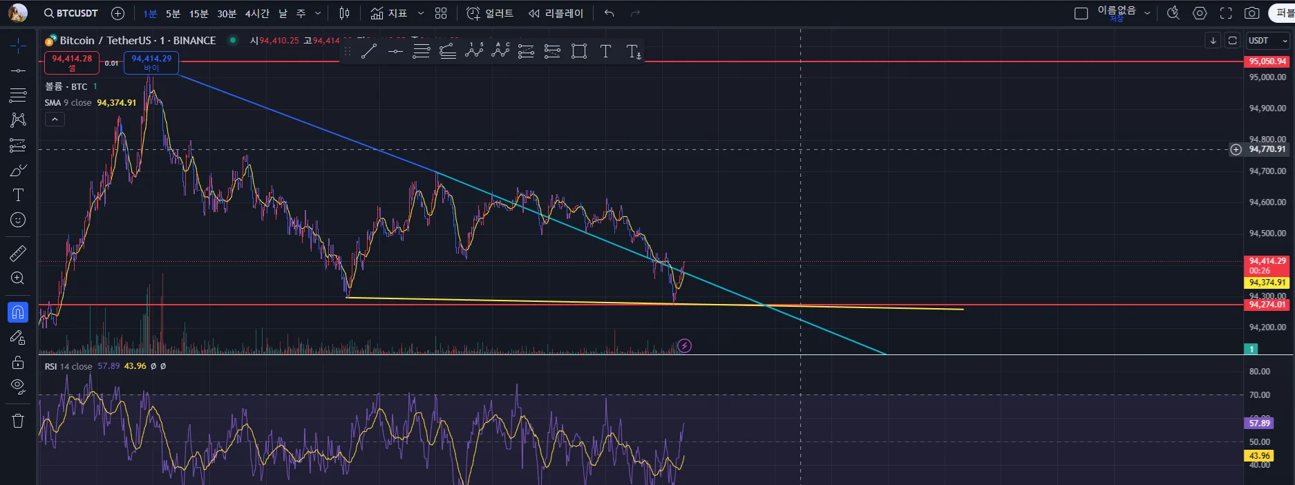 고점 과 저점에 지지선을 배치후 연결된건 아니지만 제가 생각하던 꼬리들을 이어보니 짧은 상승을 반동하는 하락국면으로 접어들다 하방지지선을 뚤고 박스를 형성할것같습니다. 처음이라 여러가지로 어렵네요