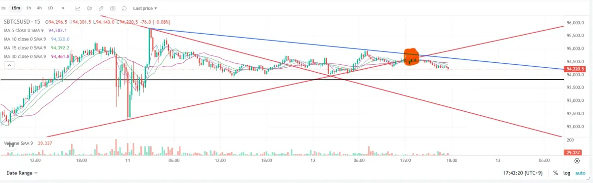 파란선저항을 맞고 떨어진후에 빨간색 장기 우상향 추세선에서 지지 없이 깼기 때문에 해당 부근 매수