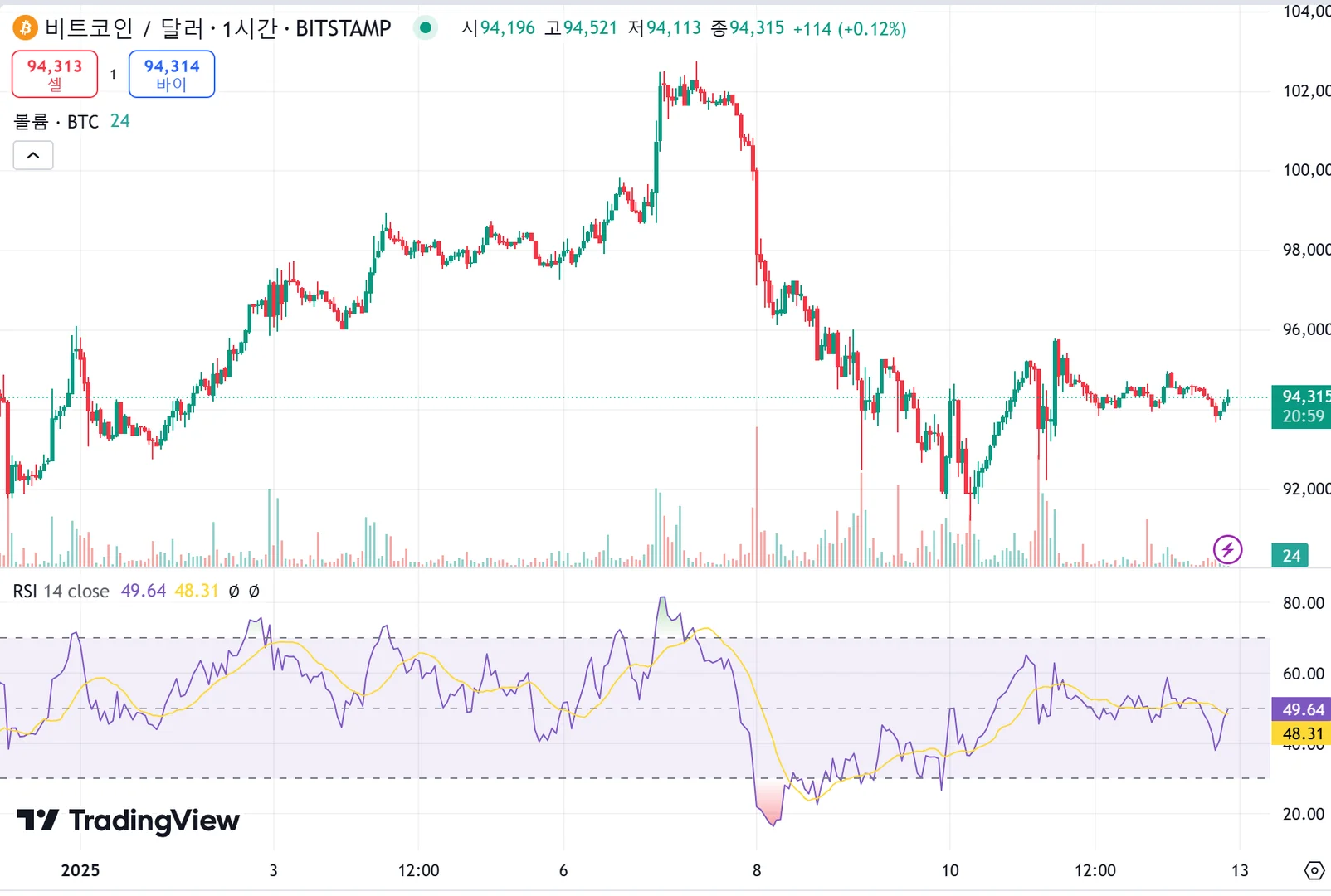 오전 7시, RSI는 과매수 국면임을 가리키고 비트코인 차트의 상단선을 하향돌파하기 때문에 매도해야 할 지점