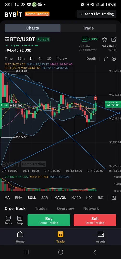 비트 4시간봉ㅡ1시간봉ㅡ15분봉 기준으로 추세선 작도한 결과 94550에서 매수 시드 25프로 진입을 위해 걸어두었습니다.