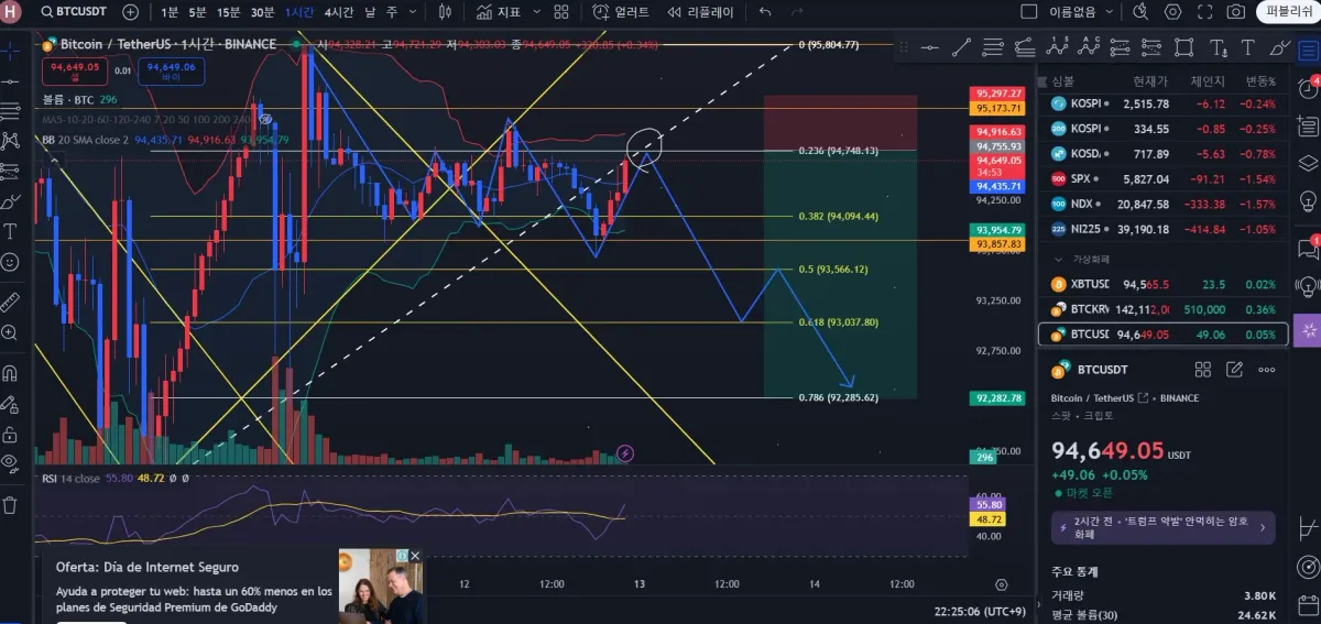 대표님 영상 강의를 듣고 일봉과 4시간봉, 1시간봉의 지지와 저항,추세선까지 나름 작도하며 매물대 확인 및 RSI지표을 확인해서 1시간 봉으로 보아 94,748에서 저항 받아 내릴것으로 판단되어 숏으로 걸었습니다 진입은 94,748로 걸었으며 손절은 95,297,익절은 92,285 잡았습니다 (아직 체결이 안된 사항입니다 / 지방으로 출장와서 필수인증이 늦어졌습니다 코린이라 잘한건지 모르겠네요)