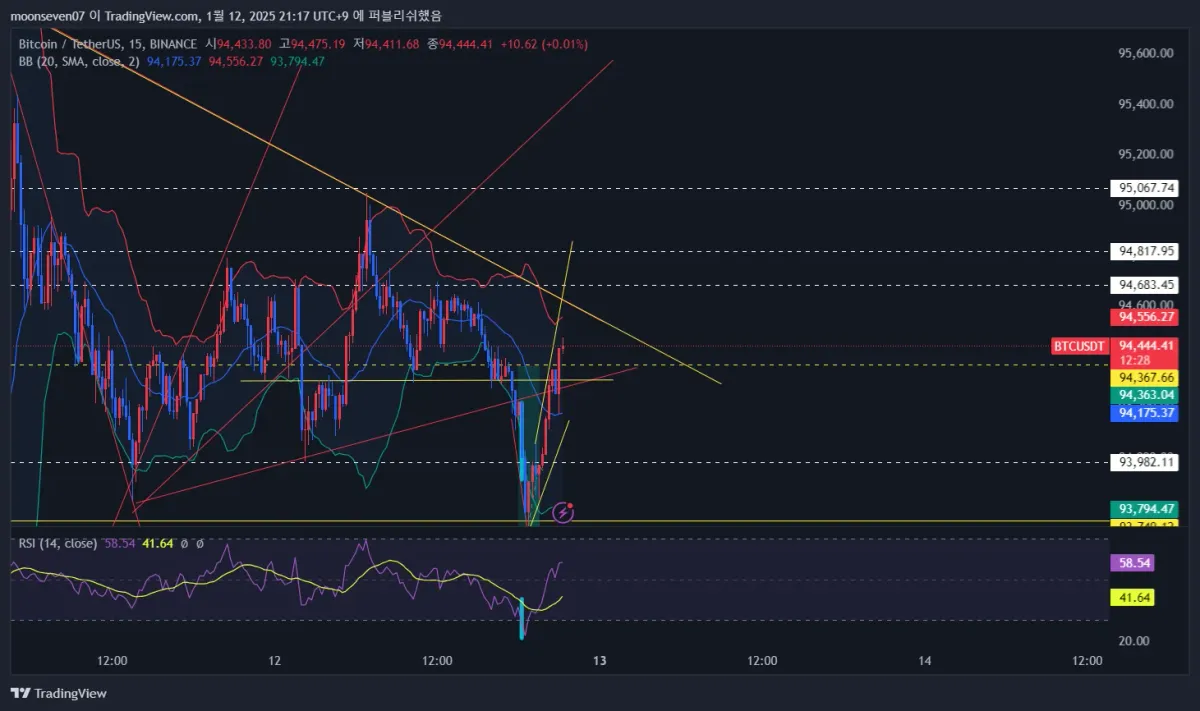 반등후 94,362 저항선까지 상승할수 있어보여 지켜보다 익절하였습니다.