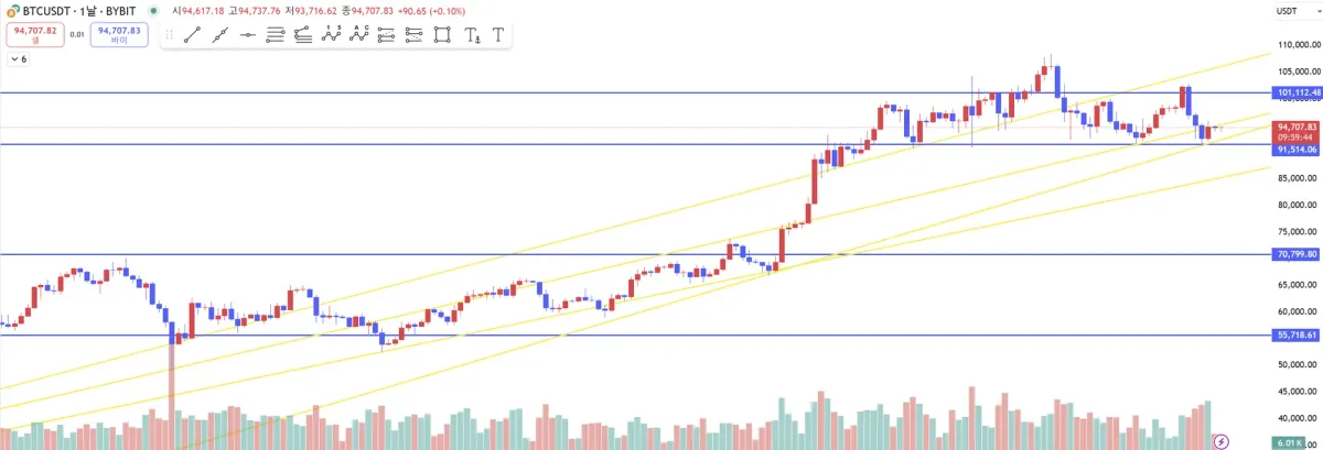 현재 비트코인은 고점과 저점이 점진적으로 높아지고 있으며, 상승 추세선이 유지되면서 큰 거래량, 조정 없이 안정적으로 상승하고 있다고 판단됩니다. 즉, 상승추세에 있다고 파악됩니다.