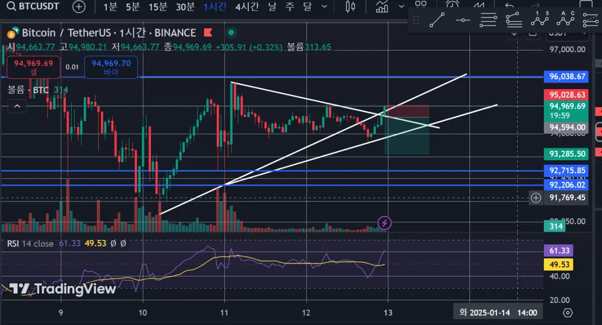 시간봉상 이탈이 확실해진다면, 손절을 해야겠다. 손절가는 95028이다.