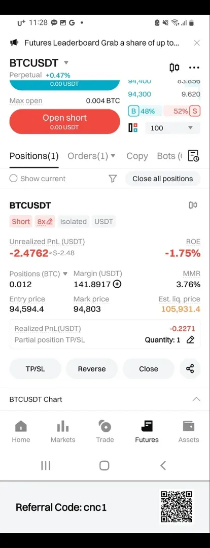 1시간봉 상으로 거래량이 미진하며 삼각수렴의 형태를 보임. 추세선을 맞고 내려가는 것을 숏으로 노려보았다. 그러나, 내가 그은 삼각수렴 추세선을 벗어나는 모양으로 보인다.